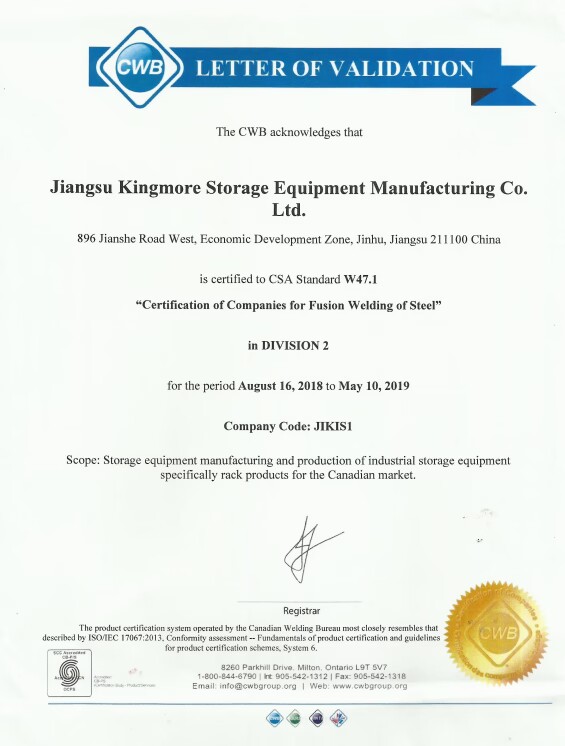 The CWB certifies that Kingmore's steel pallet racking systems comply with strict Canadian standards for welding and fabrication. This provides you with: